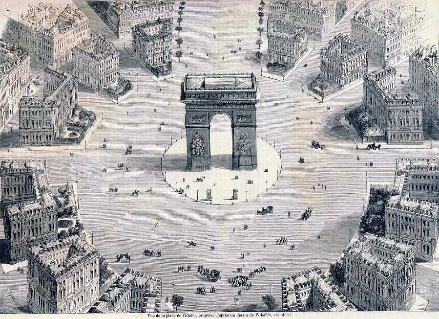 The Place de l’Étoile was extensively redesigned by Baron Haussmann, who increased the number of avenues radiating from this star to twelve. In the 1860s he ran a circular road (rue de Tilsitt-Presbourg) round the outside of the houses fronting the Étoile, a planning feature intended to free the Place itself from the crush of carriages that might be expected where so many stylish tenants lived so closely together. Haussmann imposed a uniform design on the house fronts with small gardens at the back giving on to this circular road. Haussmann’s memoirs publicly noted that the official façade design, from Hittorff in his own office, was so poor that he had to mask the fronts with trees. But the uniformity complements the Arc’s monumental presence. The traffic problem was not resolved, however.
